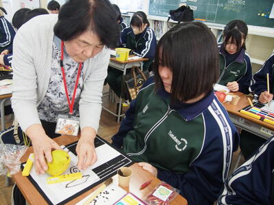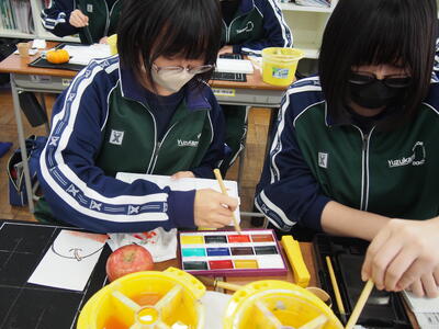 絵手紙の先生の丁寧な指導のおかげで、楽しく授業を進めることが出来ました。描き上がった絵手紙は、施設利用者の高齢者にお届けする予定です。