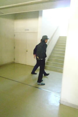 男性職員が「さすまた」を使い、取り押さえる訓練の現場。