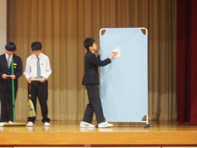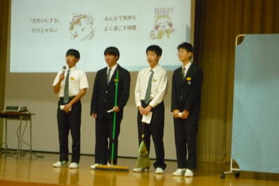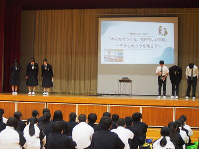 11月18日(水)生徒集会で、健康委員会が『みんなでつくる、気持ちのいい学校 ~そうじのコツを知ろう~』を発表しました。