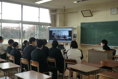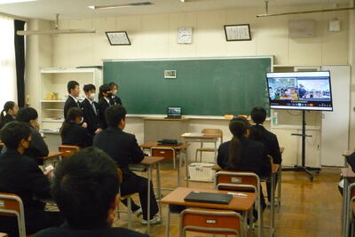 1年生入学式から始まり、3年修学旅行、2年東京研修、体育祭等の写真を見ながら前期を振り返りました。