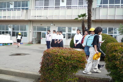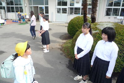 湯小でのあいさつ運動には、10名の中学生が参加しました。懐かしい校舎、恩師に朝からテンション爆上がりです。登校してくる小学生たちを、明るいあいさつで迎えることができました。
