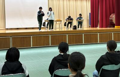 はじめに中学1年生が、朝の登校から放課後の部活動まで、中学校の1日を劇やクイズを交えながら楽しく紹介しました。その後、教員による詳しい説明を行いました。