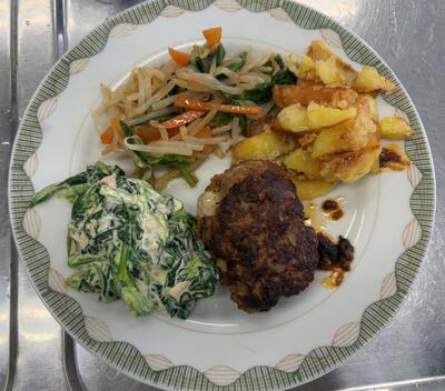 今回はハンバーグとポテトフライや和え物等の付け合わせを作りました。
