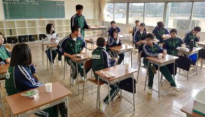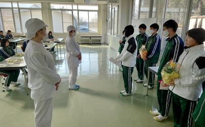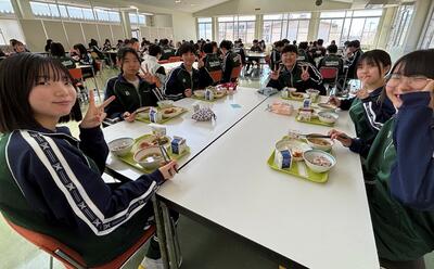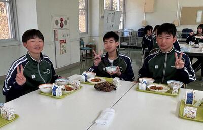 今日は3年生にとって最後の給食となりました。普段は学年ごとに食べている給食ですが、今日は縦割り班で食べました。みんな笑顔で、楽しく食べていました。3年生の皆さん、大好きだった給食をずっと忘れないでください。