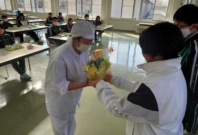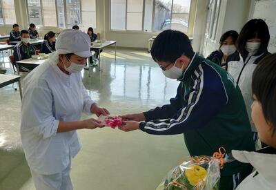 「毎日美味しい給食を作ってくださっている調理員さんたちに、感謝の気持ちを伝えたい!」ということで、給食委員を中心に企画し、「給食感謝の会」を行いました。給食委員長が代表して御礼の言葉を述べ、生徒全員からのメッセージカードとお花を贈りました。