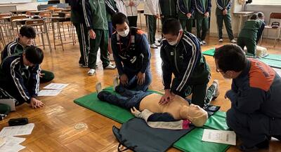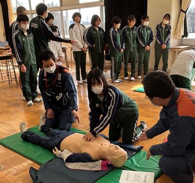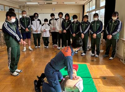 那須地区消防湯津上分署から4名の消防士さんにお越しいただき、緊急の場合の救命活動についてご教授いただきました。実際にAEDを使っての演習は、臨場感があり、大変有意義な活動でした。