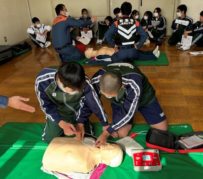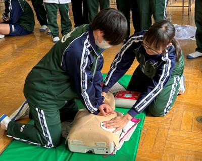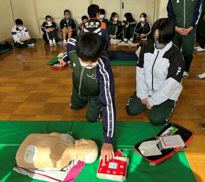 本日、2年生保健体育の授業で、救急救命講習会を行いました。