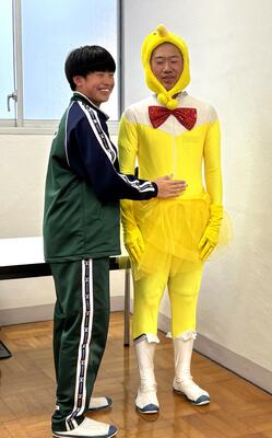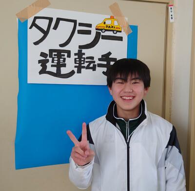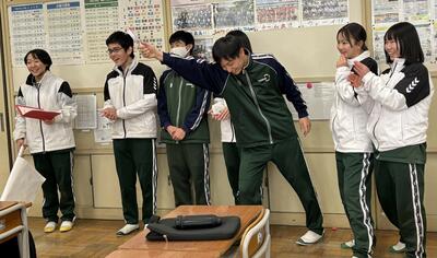 受験勉強で忙しい3年生に少しでもリラックスして楽しいひとときを過ごしてもらおうと、アイディアをこらしました。3先生は4班に分かれ、ツアーガイド役の1・2年生が案内する部屋へ。それぞれの部屋では1・2年生がコントや寸劇を行い、全力で3年生を笑わせました。