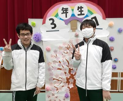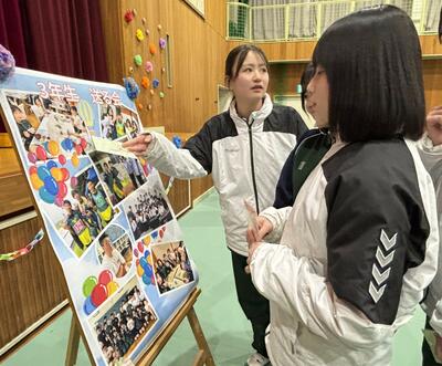笑いのツアーが終わって体育館に戻ると、そこには3年生の思い出の写真がいっぱいに飾られていました。1・2年生からの感謝のメッセージも置かれ、感動の涙を流す3年生もいました。