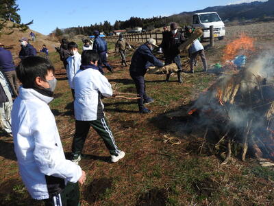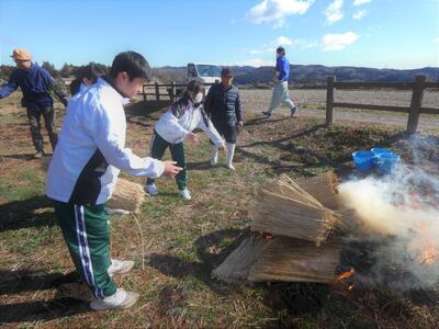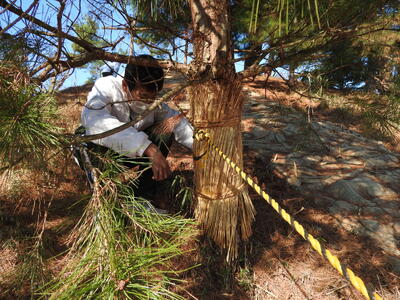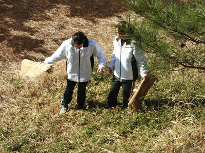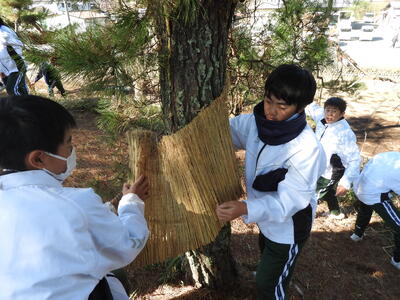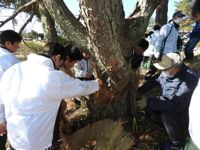 こも外し ブログ 03/06 パブリック 校長 3月5日(木)は、啓蟄の日。啓蟄は、冬ごもりしていた虫や生き物が暖かさを感じて土の中からはいでてくる頃を指します。二十四節気の3番目、春の訪れを告げる時期です。寒さが和らぎ、春雷が鳴り、春の植物が芽吹く頃として知られています。 この日に、松守会が侍塚古墳の松の木の「こも」を外します。それを中学1年生全員が体験しました。