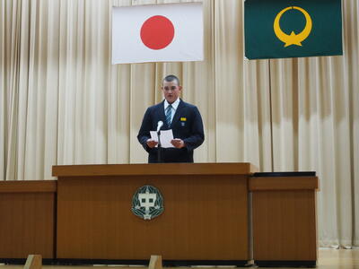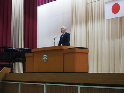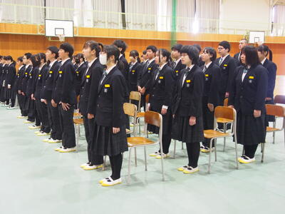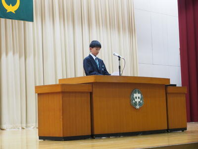 1年生代表は「今日までの一年間は、私たちにとって多くのことを学ぶ大切な時間でした。学習の面では、小学校よりも内容が難しくなり、自分の努力がより必要になると感じました。毎日の積み重ねが自分自身の成長につながるということを実感した一年でもあったと思います。また、学校生活を送る中で、協力することの大切さや相手の立場を考えて行動することの重要さも学ぶことができました。4月に新1年生が入ってきます。後輩を迎える立場となり、これまで以上に自分の行動に責任をもつことが求められると思います。これまでの経験を生かしながら、学習や学校生活にさらに真剣に取り組み、視野を広げて行動し、信頼される存在になりたいです。」(一部抜粋)
