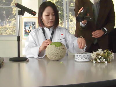 フルーツカービングを始めたきっかけやくじけそうになったこと、そこから自分を奮い立たせて今に至る経緯を話してくださいました。講演の後は、実演です。目の前の「メロン」が・・・